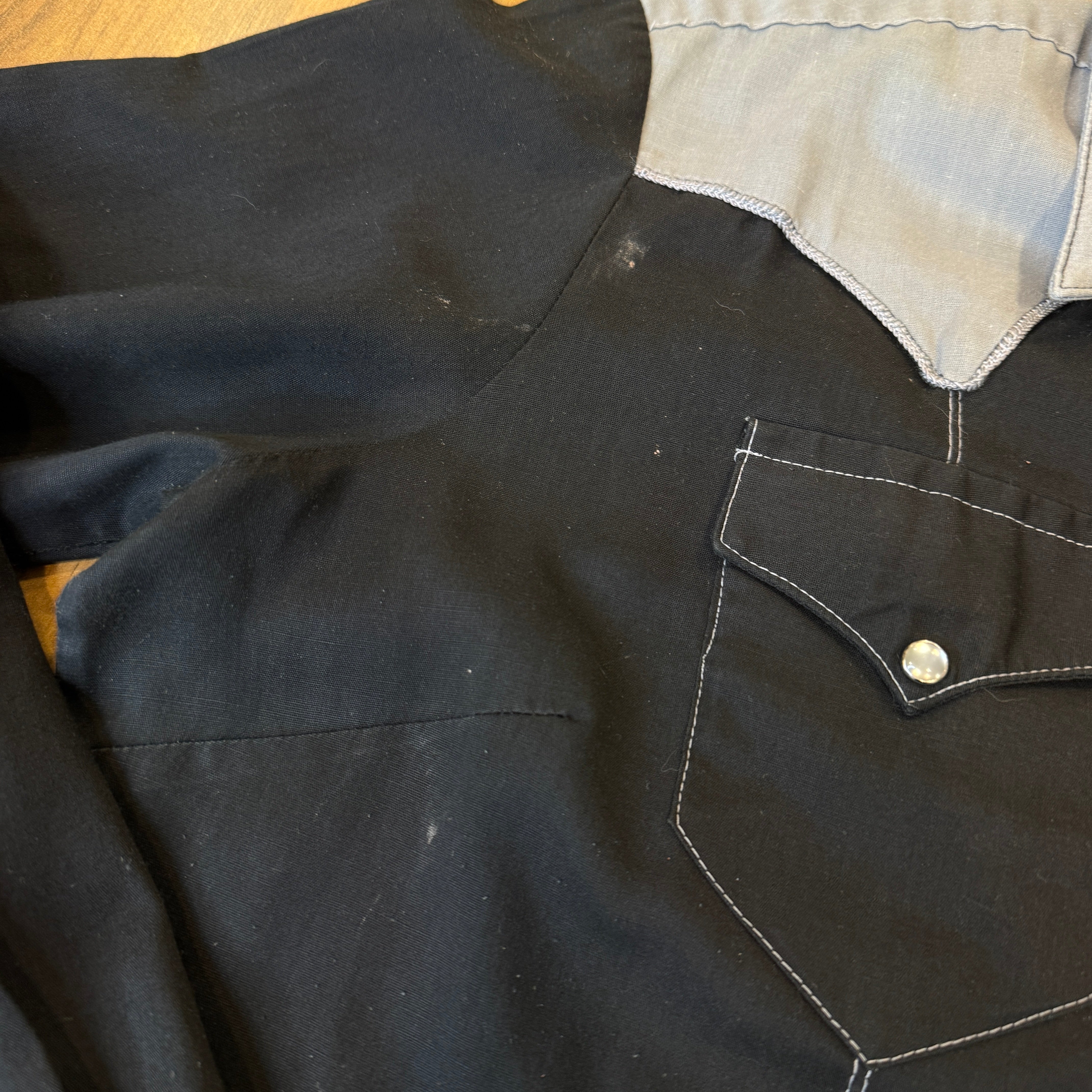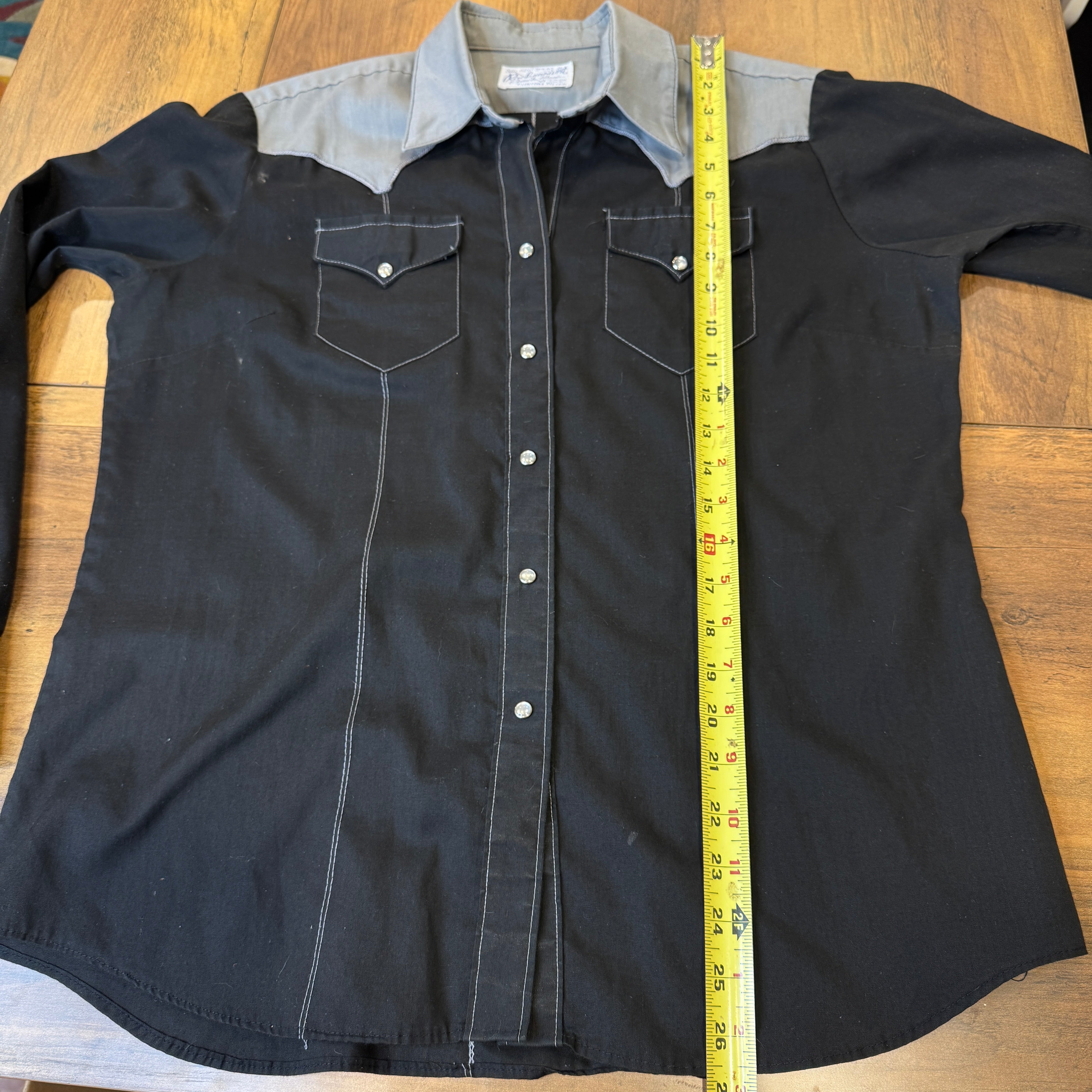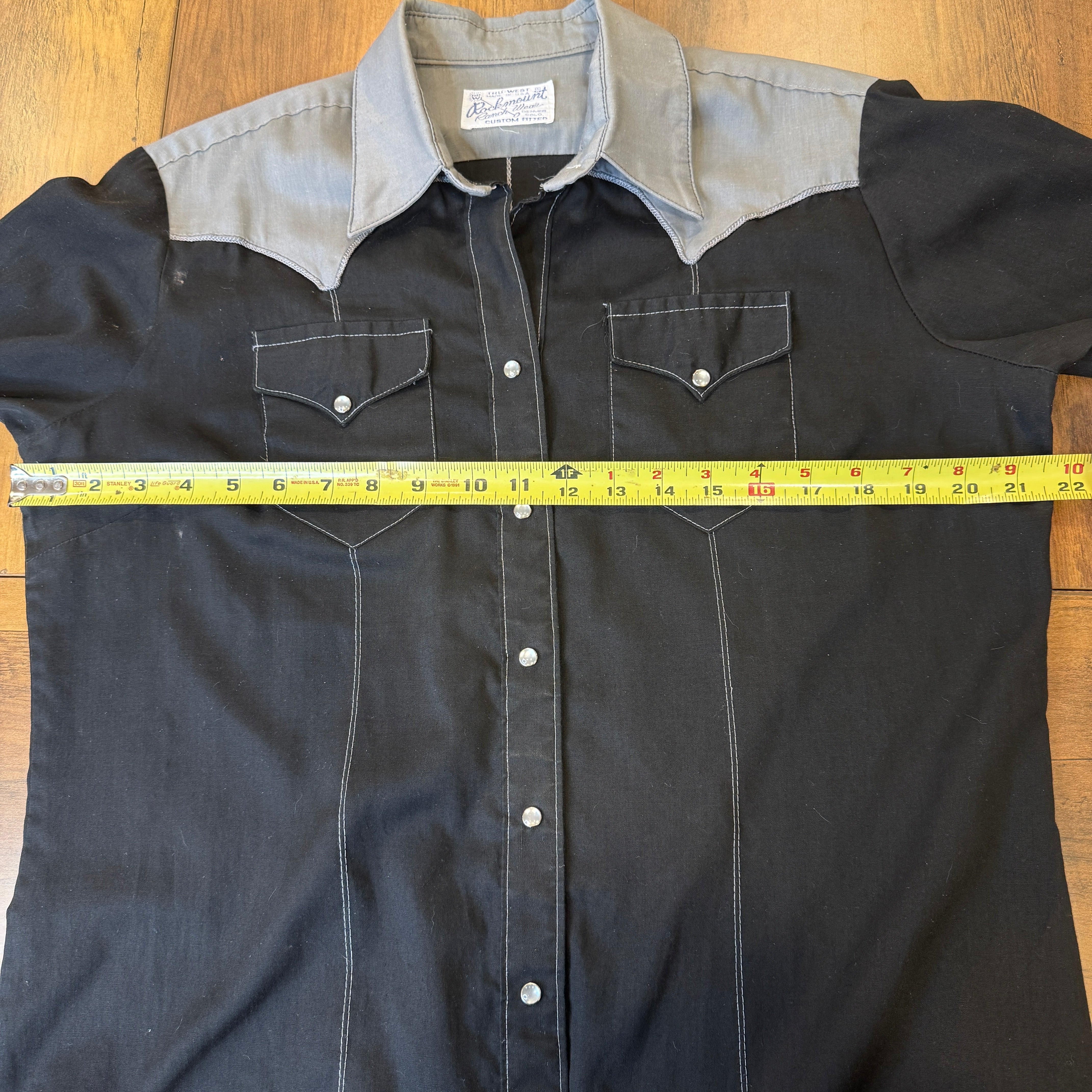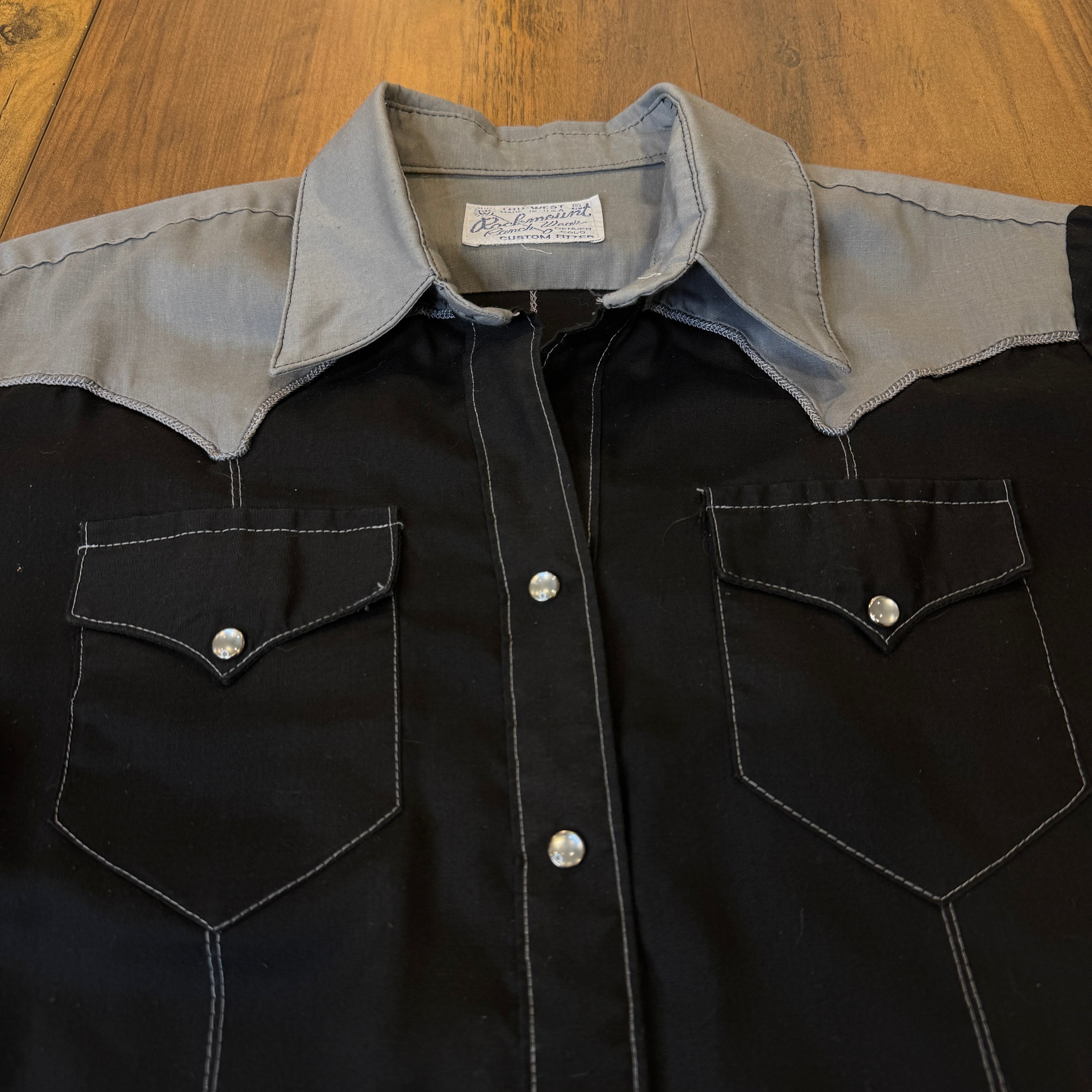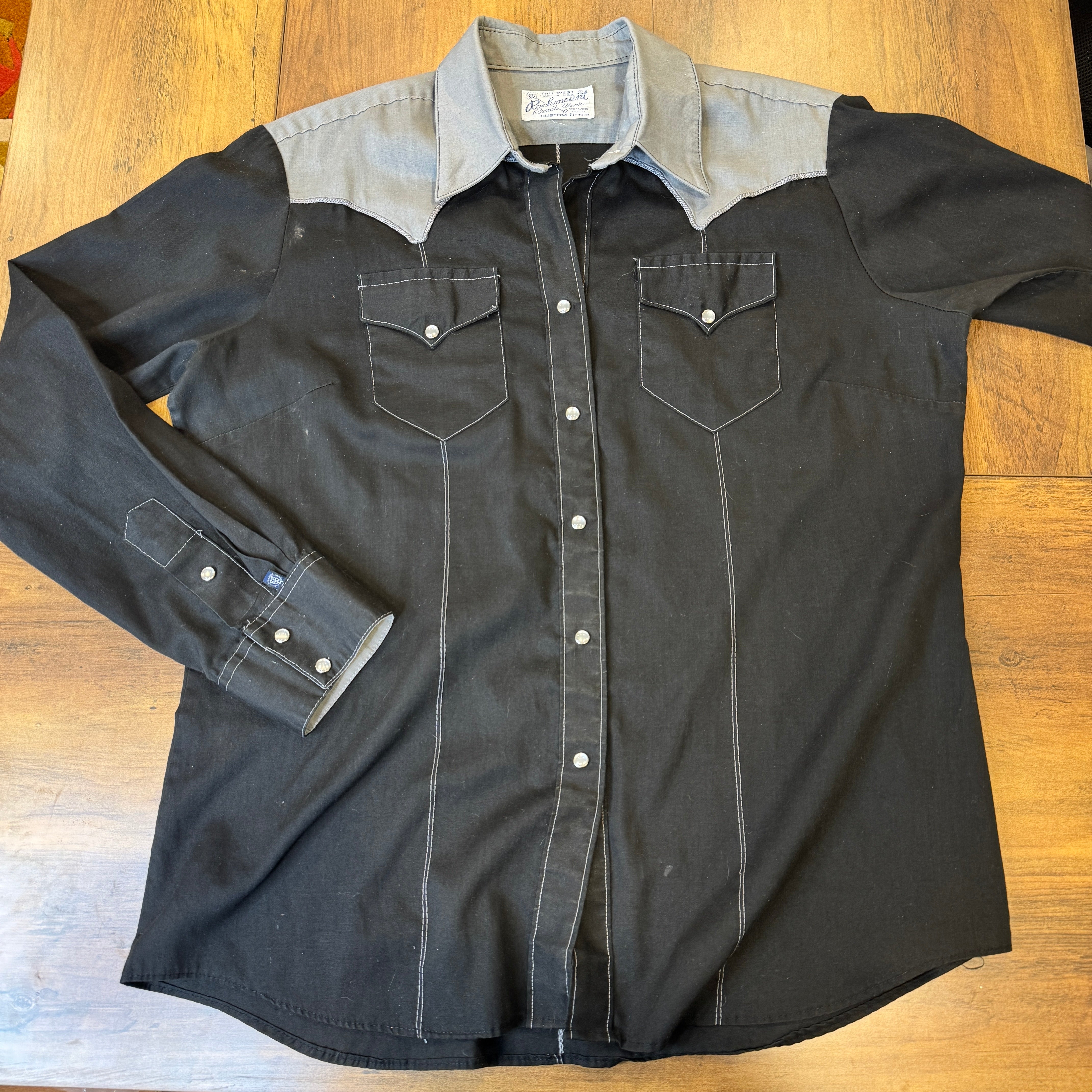 Experience timeless vintage style with this 70s Rockmount Ranch Wear Pearl Snap Button Down. The two tone black and grey design is elevated with an embroidered eagle on the back. With bust darts for a flattering fit and a small washable stain on the right armpit, this women's shirt is both stylish and functional.
