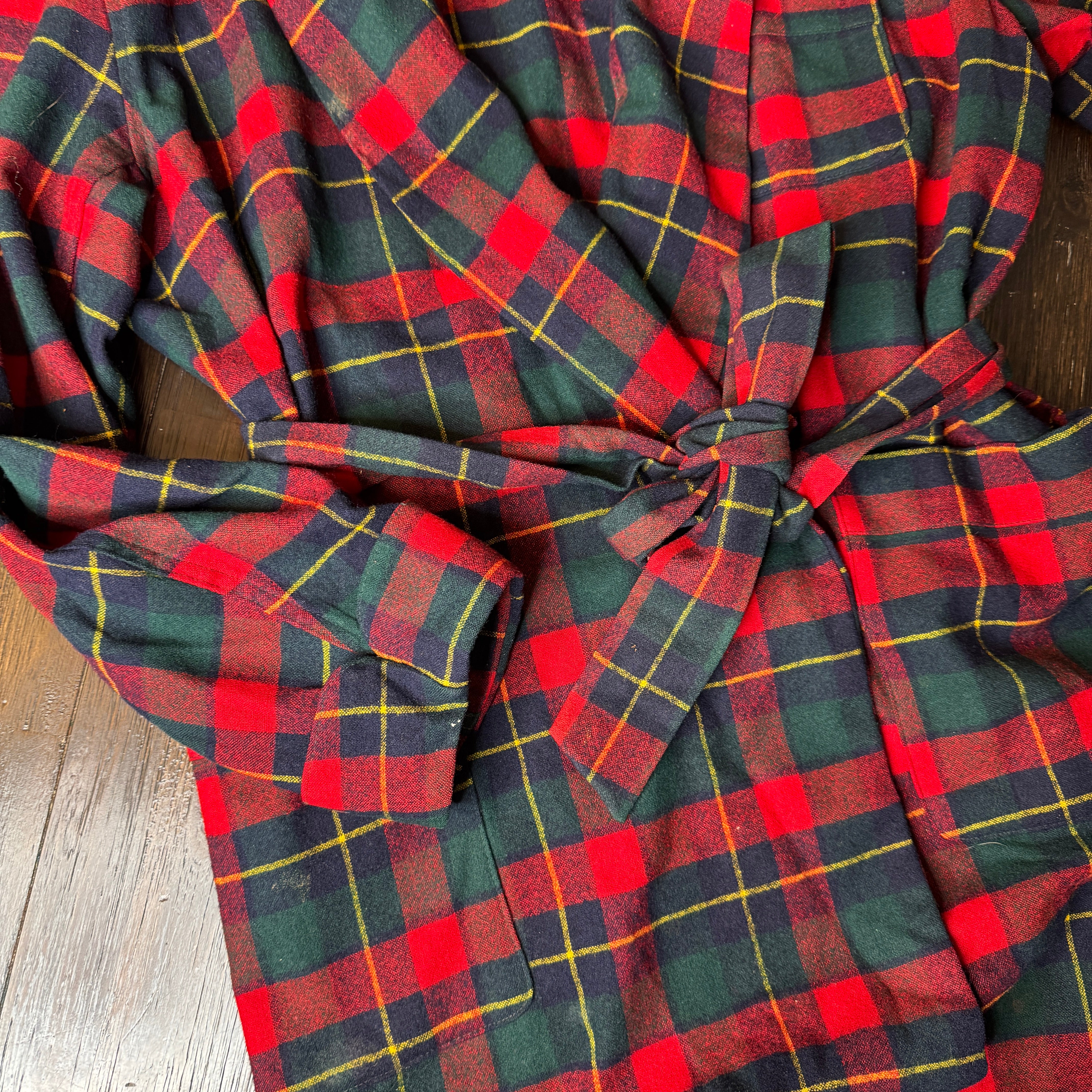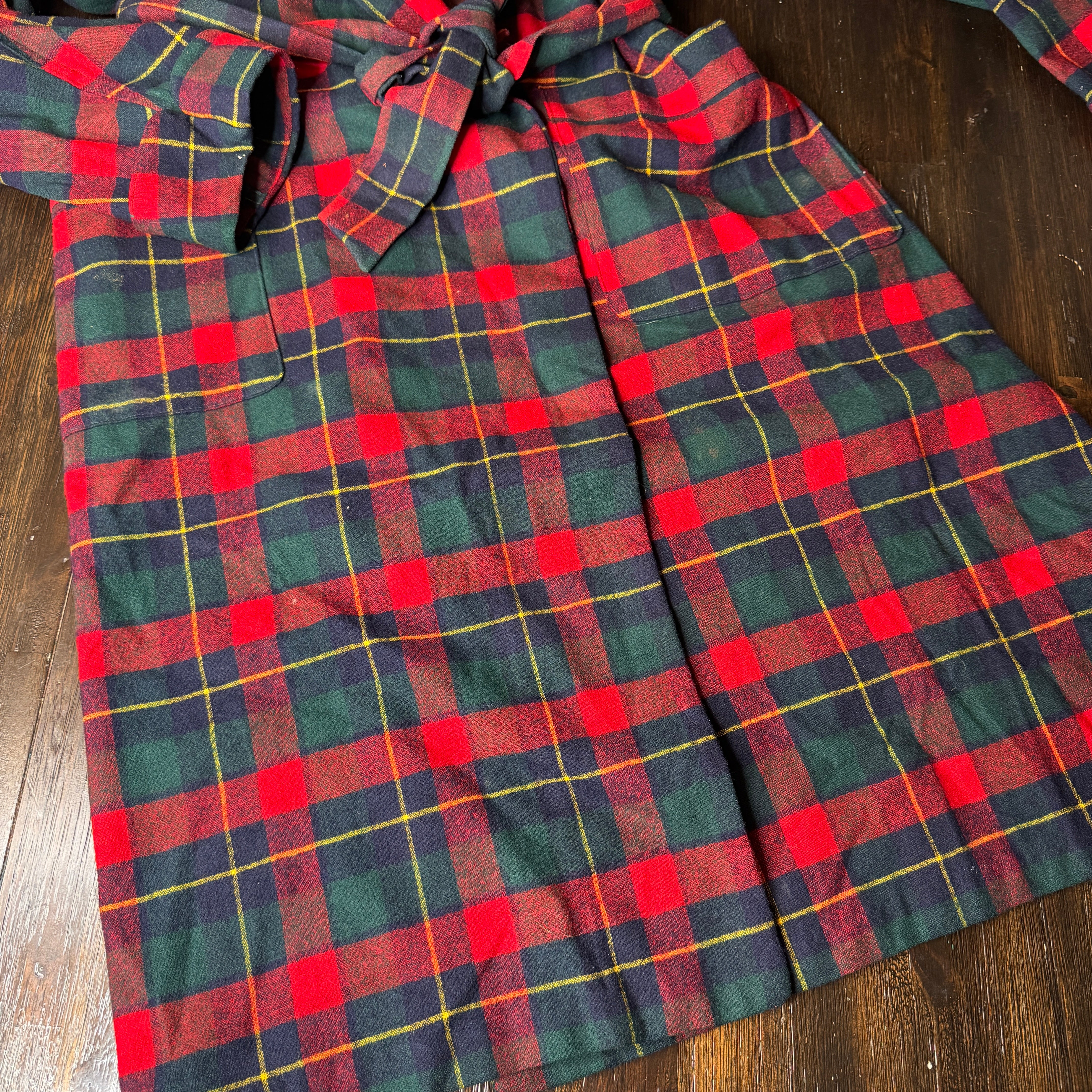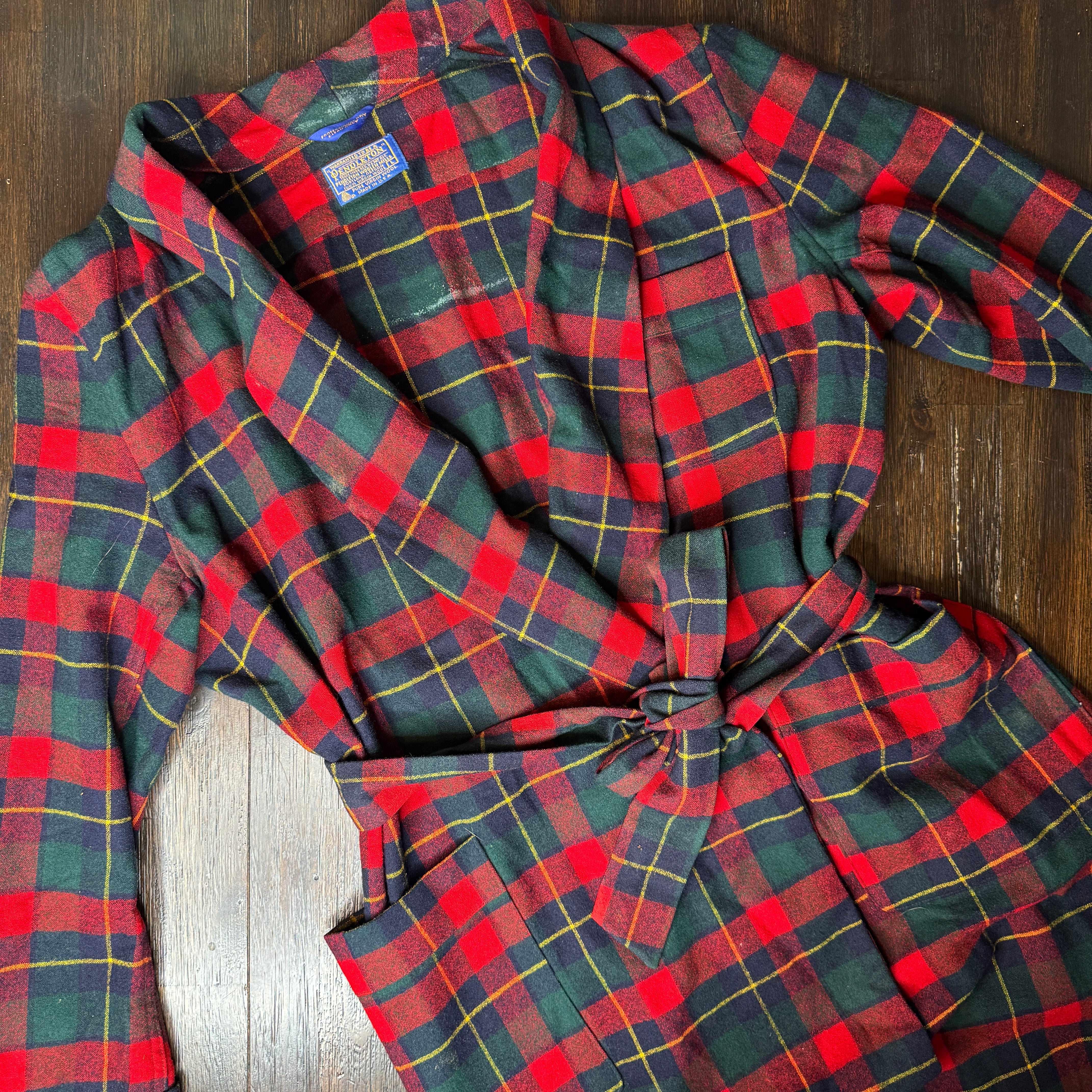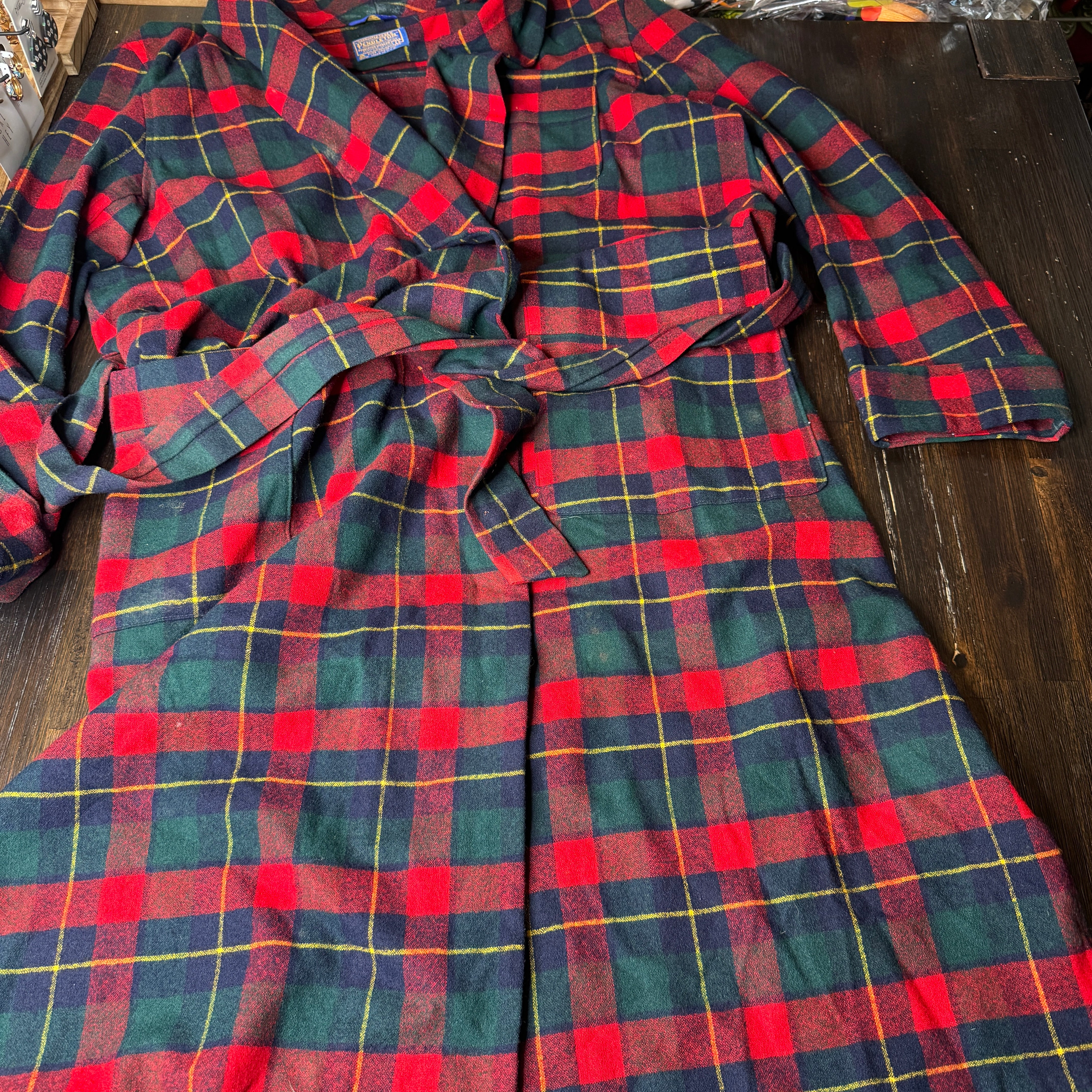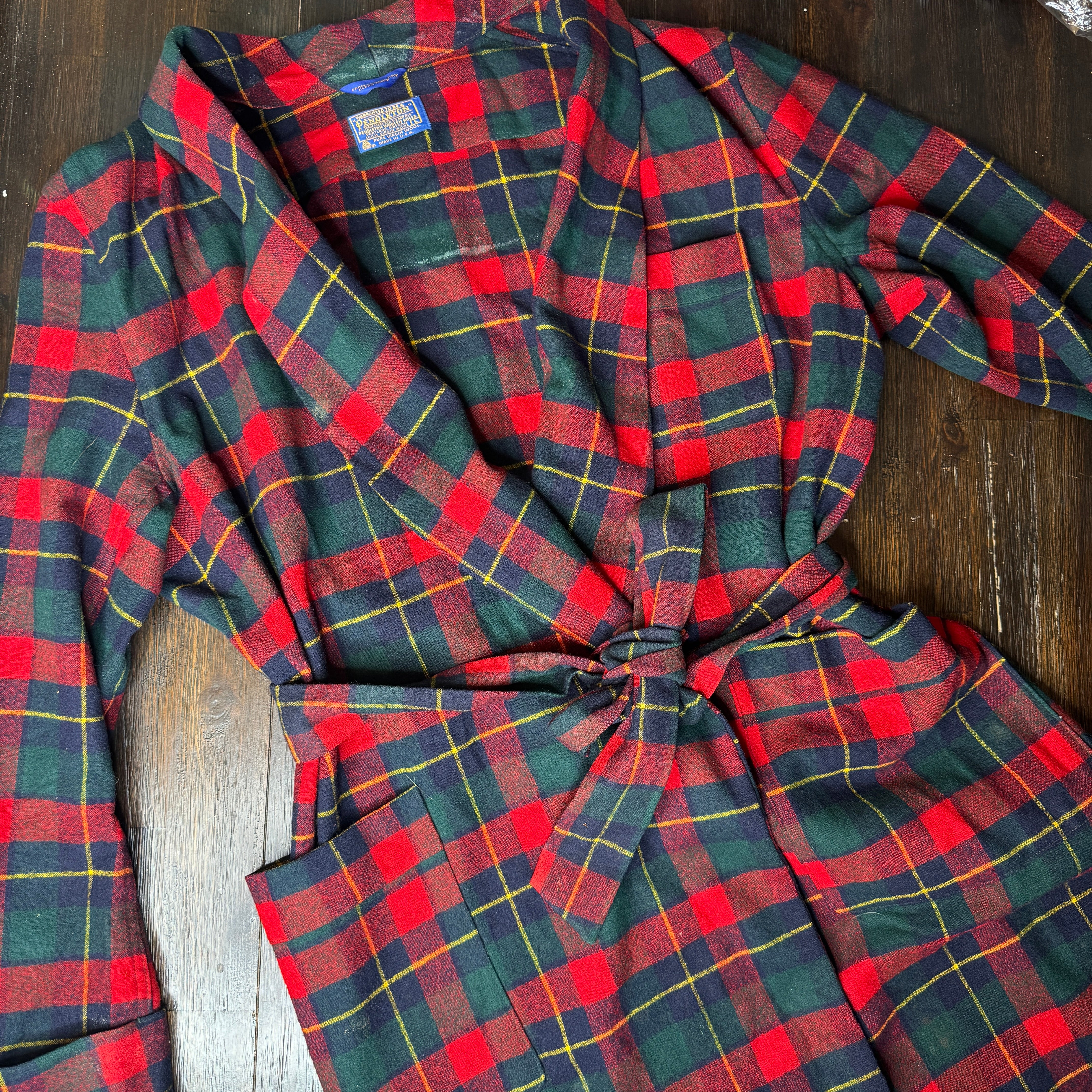 Expertly crafted from 100% pure virgin wool, this Pendleton robe features a classic red, navy, green, and yellow plaid design. Perfect for cold nights, the vintage robe also boasts a large size for added comfort. Please note, there may be minor flaws, as seen in photos.