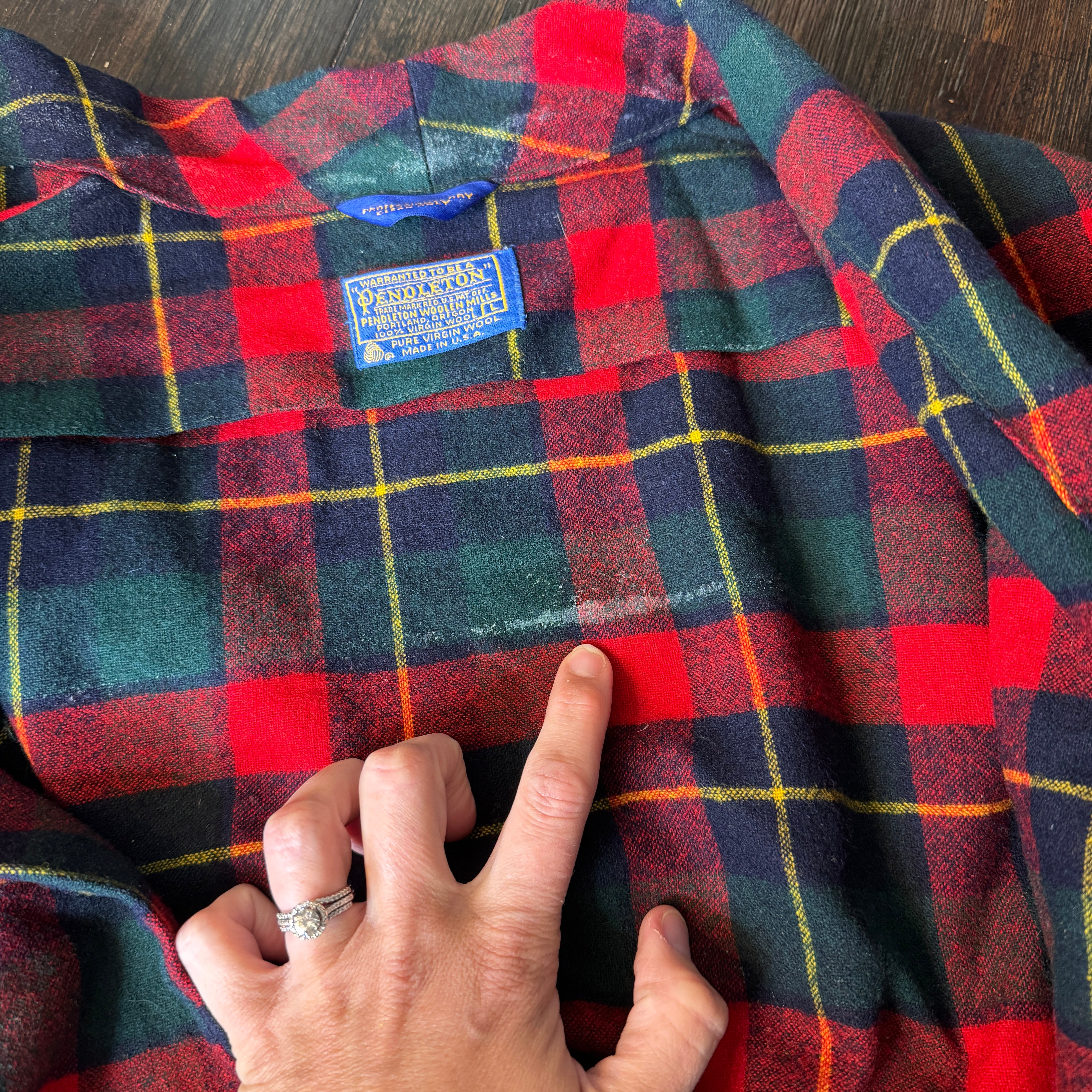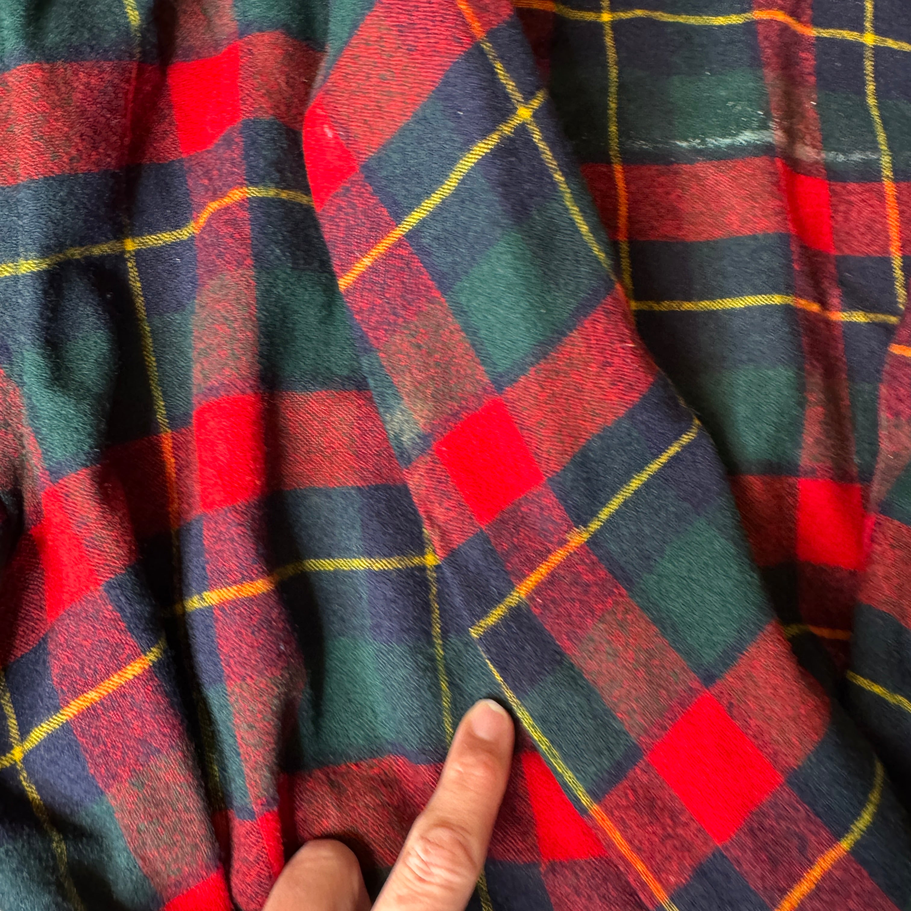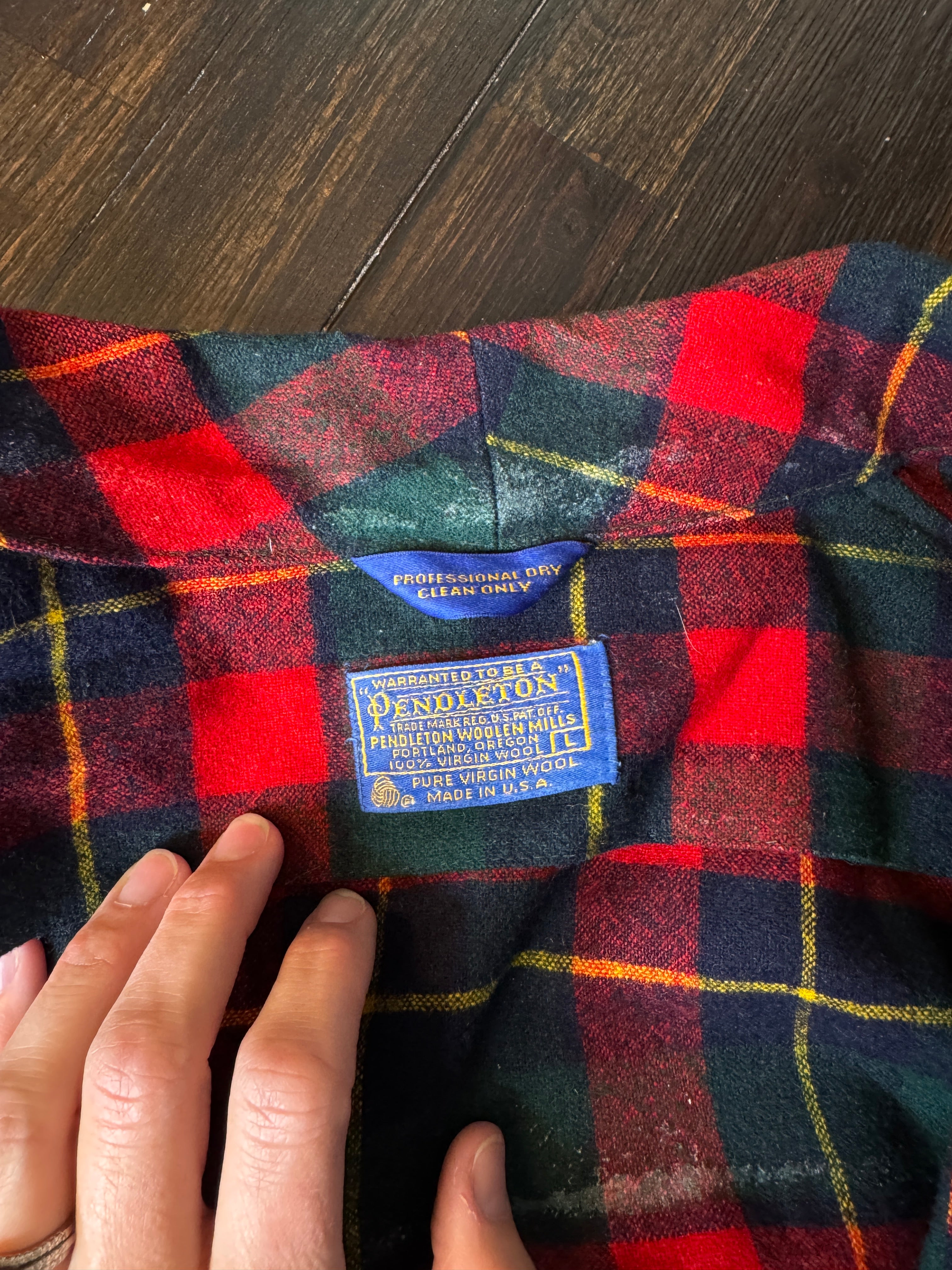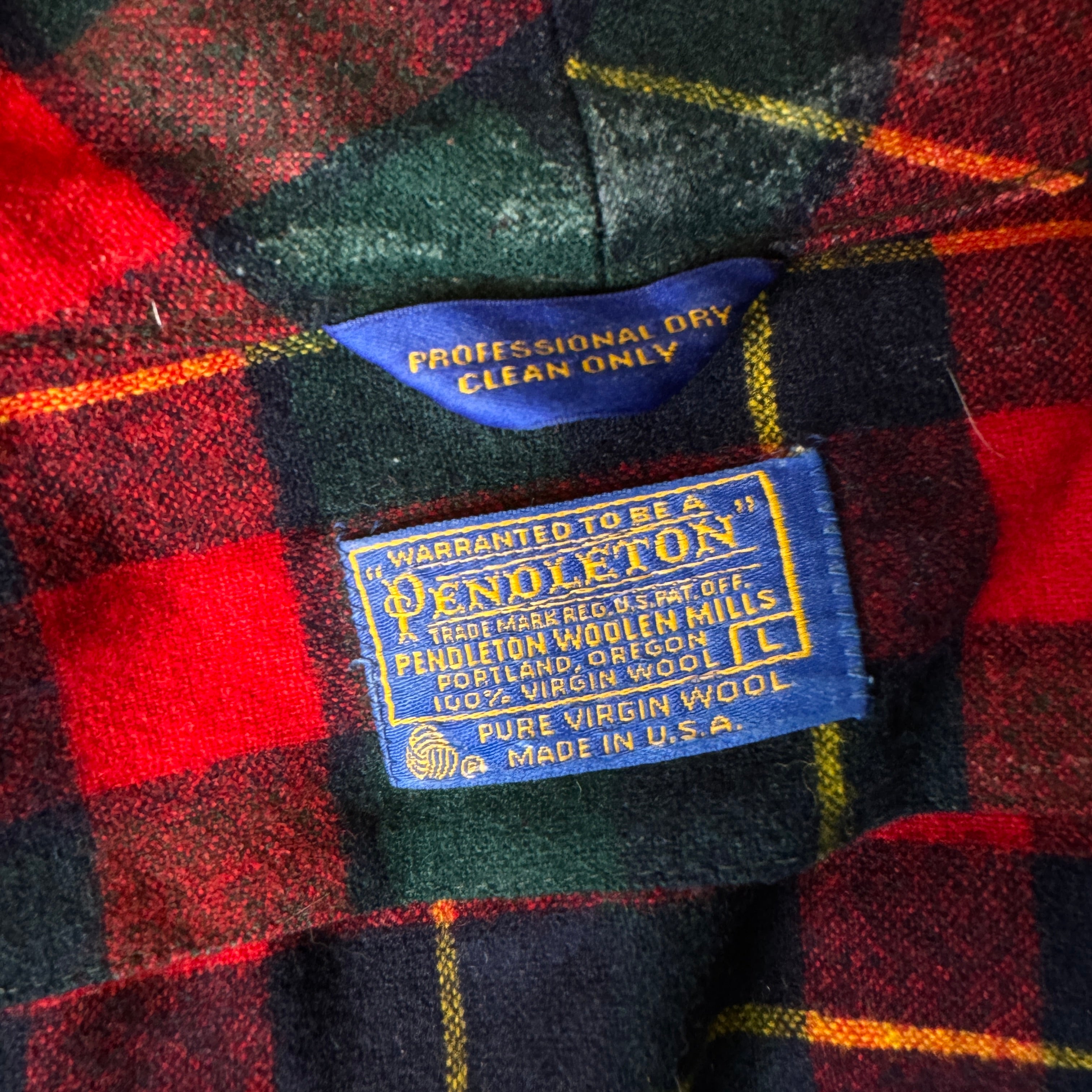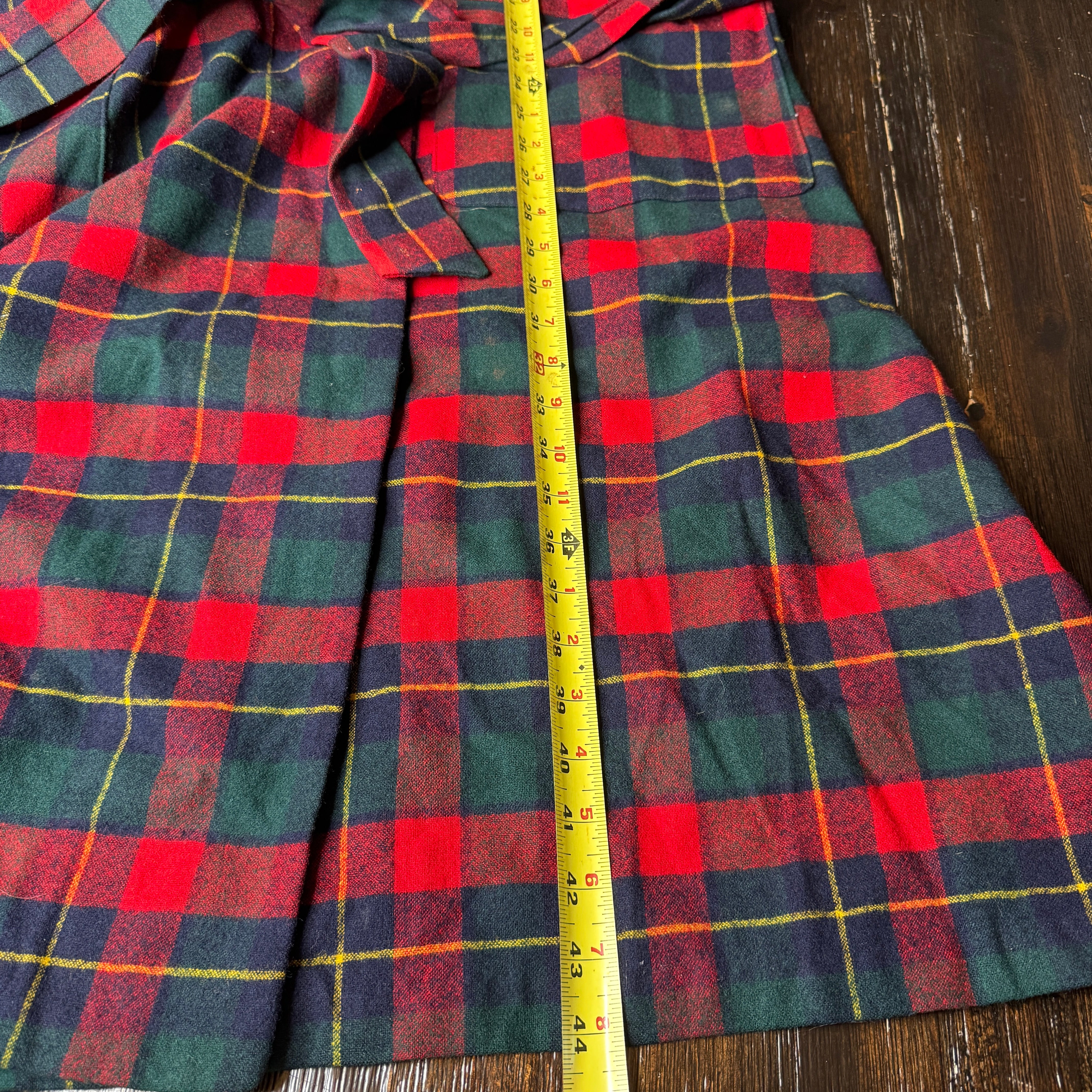 Expertly crafted from 100% pure virgin wool, this Pendleton robe features a classic red, navy, green, and yellow plaid design. Perfect for cold nights, the vintage robe also boasts a large size for added comfort. Please note, there may be minor flaws, as seen in photos.