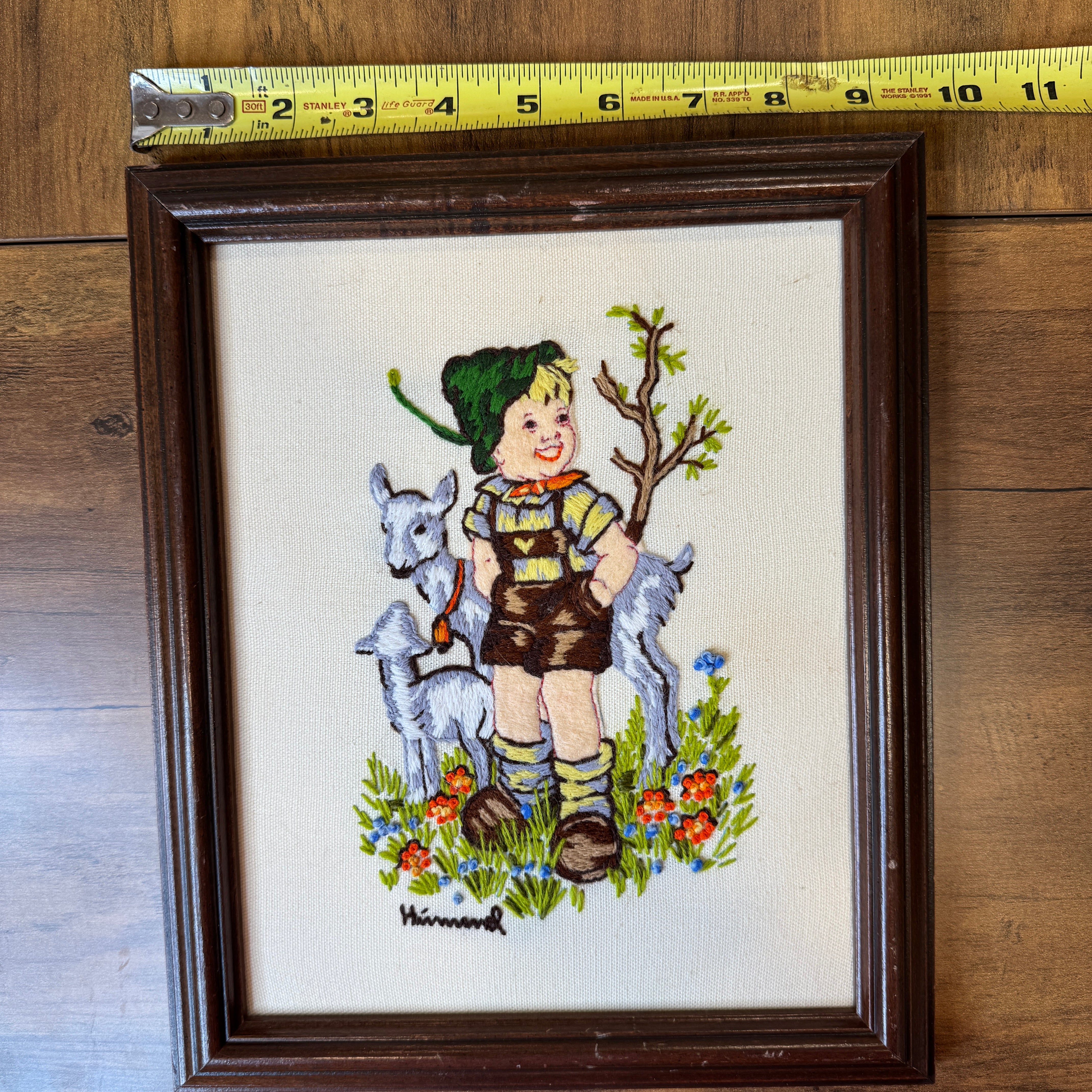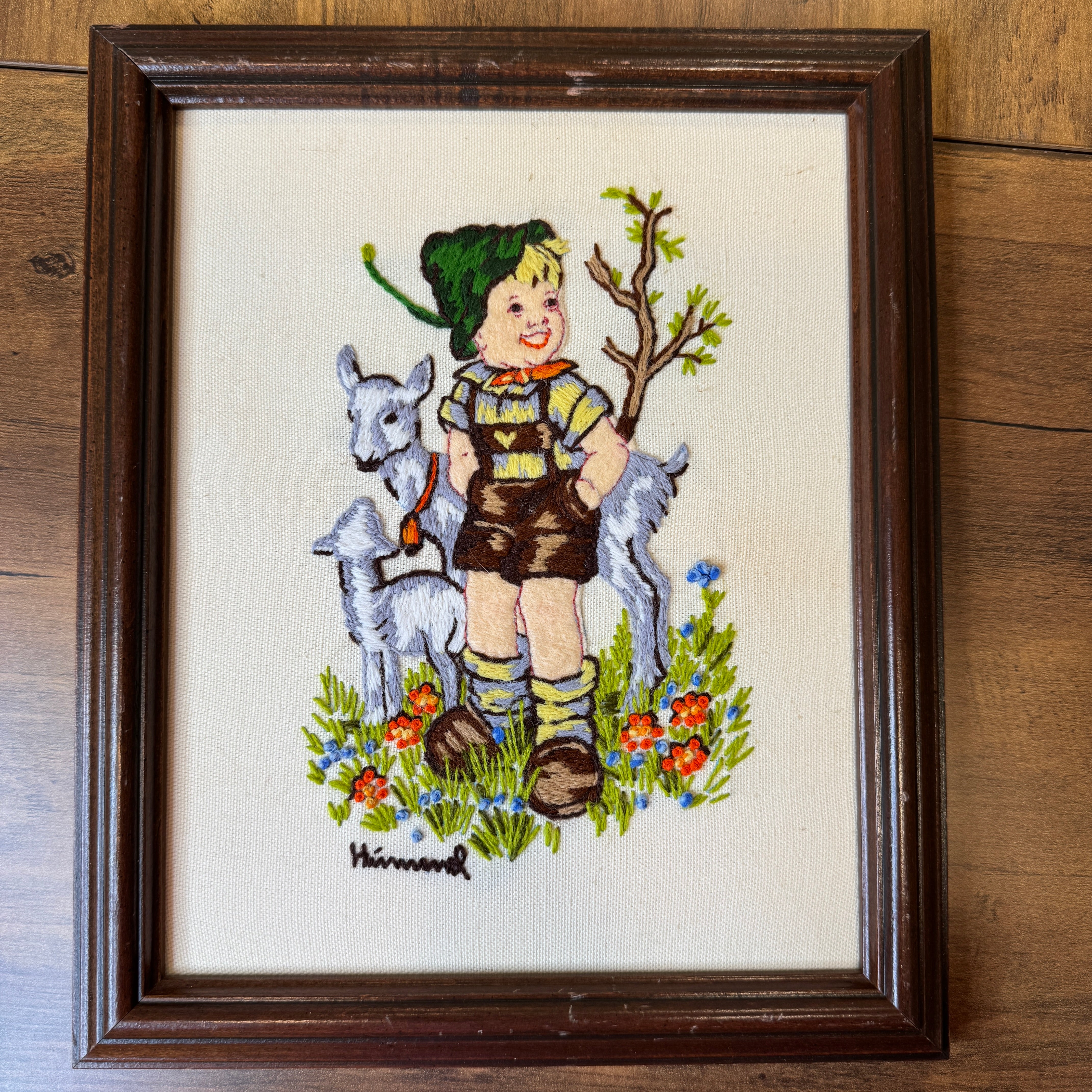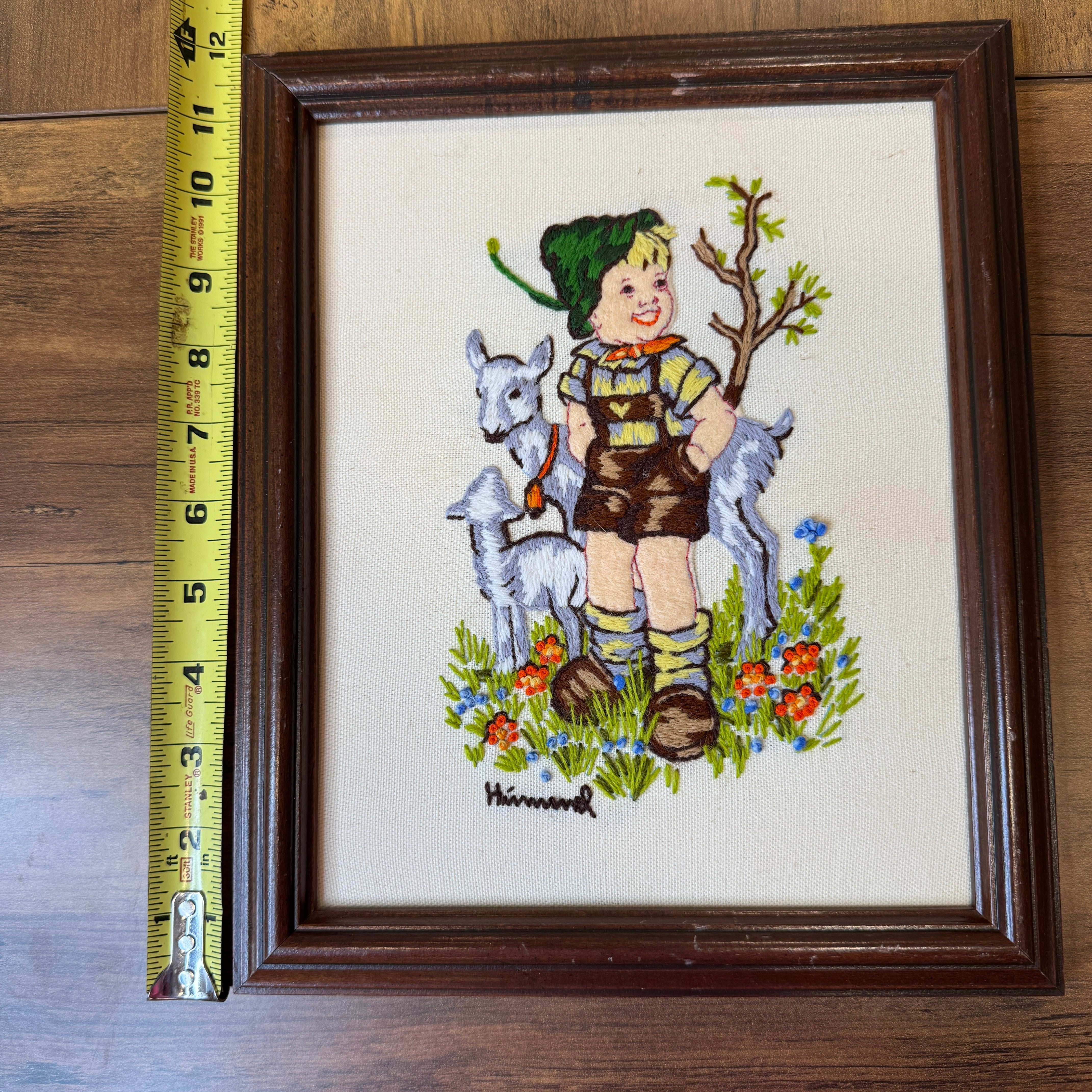 Add some whimsy to your home with this vintage completed crewel of a Hummel print featuring a boh and sheep. This comes framed in a wood frame and measures approx 9.5” x 12”
